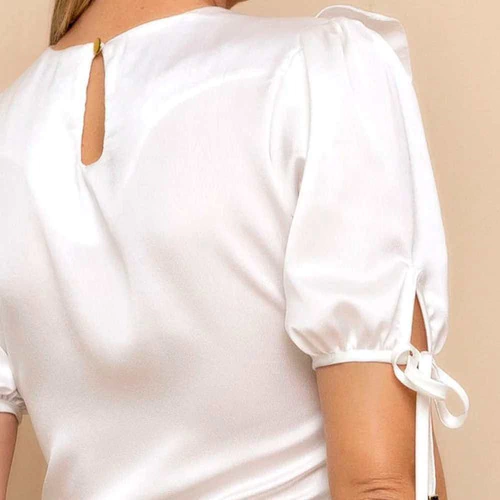 Blusa Plano Off White Laura Rosa desenvolvida em tecido Plano em cor Off White possui toque leve e agrad vel no corpo sendo perfeita para dias quentes de Ver o Sua modelagem solta veste de forma confort vel todos os bi tipos femininos Detalhe de tecido diferenciado com babado no busto deixa o visual cheio de delicadeza Possui mangas curtas com amarra o lateral sendo ideal para mulheres que amam riqueza de detalhes Apresenta aviamentos em Dourado e pespontos em cor Palha Sem d vidas pe as em tonalidades claras s o o cl ssico da moda feminina indispens vel ao seu guarda roupa pois al m de produzirem composi es belas elas s o vers teis na hora de compor looks para o trabalho culto e passeios Cor Branco Off Tecido Plano 100 poliester Medidas Tamanho P Busto 94 Cintura 78 M Busto 98 Cintura 90 G Busto 108 Cintura 96