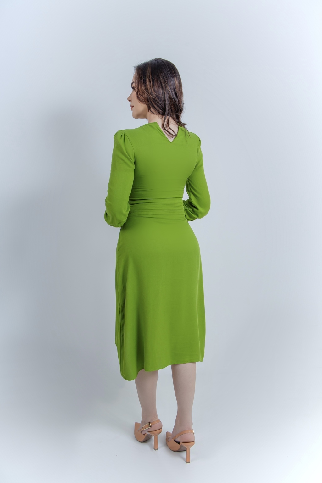 Vestido Midi Verde Manga Longa Jana Marçal, peça superconfortável e elegante, possui manga longa com punho largo e fechamento com tres botões forrados, gola redonda com detalhes de costura no busto e mitação de abertura na frente da saia com botões forrados. Detalhe na cintura tipo faixa e fechamento lateral com ziper. Barra assimetrica com alongamento na parte de tras.